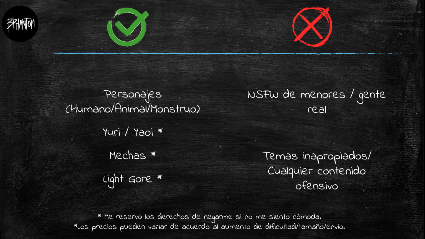 El Cliente deberá proveer a la Artista de referencias visuales para entender mejor la idea del Cliente.☆ PAGOEl Cliente deberá pagar una tarifa de adelanto del 50% previo al inicio del trabajo cuando se trate de un pago por medio de transferencia bancaria nacional (México).